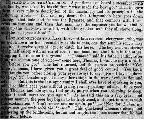 A late reverend clergyman, who was as well know for his eccentricity as his talents, one day sent his son, a lazy lad, about twelve years of age, to catch his horse. The boy went sauntering along half asleep with an ear of corn in one hand, and the bridle in the other, dragging the reins on the ground. “Thomas!” said his father, calling after him in a solemn tone of voice – “come here, Thomas, I want to say a word to you before you go.” The lad returned, and the parson proceeded. “You know, Thomas, I have given you a great deal of good counsel. You know I’ve taught you before closing your eyes always to say, `Now I lay me down to sleep,’ &c., besides a good many other things in the way of exhortation and advice. But this is the last opportunity I shall ever have of speaking to you, and I couldn't let it pass without giving you my parting advice. Be a good boy, Thomas, and always say that pretty prayer when you are going to sleep. I fear I shall never see you again.” As he said this in a very grave and solemn manner, the poor boy began to be frightened, and burst into tears with this exclamation, “You’ll never see me again, pa?” – “No; for I shall die before you get back with the horse!” This quickened Thomas’s ideas; and gathering up the bridle-reins, he ran and caught the horse sooner than he had ever done before.