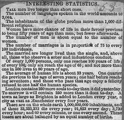 The average of human life is about 33 years. One quarter die previous to the age of seven years; one half before reaching seventeen; and those who pass that age enjoy a felicity refused to one half the human species.